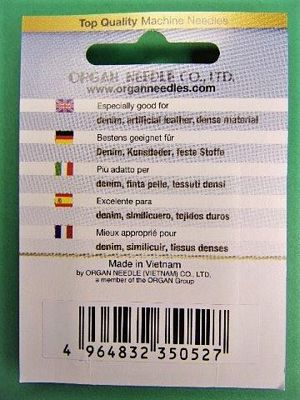 Needle Organ Jeans Card/5 Size 100/16 Slim ball point needles with reinforced blade to sew denim, canvas, and similar materials; for sewing extra thick fabrics.