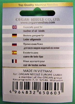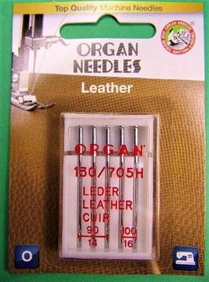 Needles Organ Leather Assorted Card with 5 per pack. Sizes (3 of) 90/14, and (2 of) 100/16 Leather cutting shape point needles ease penetration into leather and leather-like materials; alleviates bursting to achieve handsome stitches.